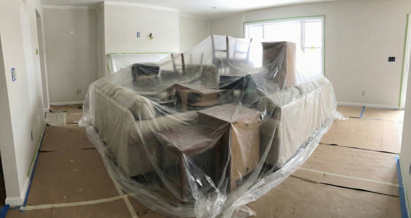 Thay vì tốn sức bê vác đồ nặng từ phòng này sang phòng khác, bạn chỉ cần dồn hết bàn ghế, tủ kệ vào giữa phòng. Cách này giúp tạo khoảng trống rộng rãi quanh tường để bạn thoải mái thao tác. Sau khi gom đồ, hãy phủ một tấm nilon lớn lên toàn bộ để bảo vệ tối đa.