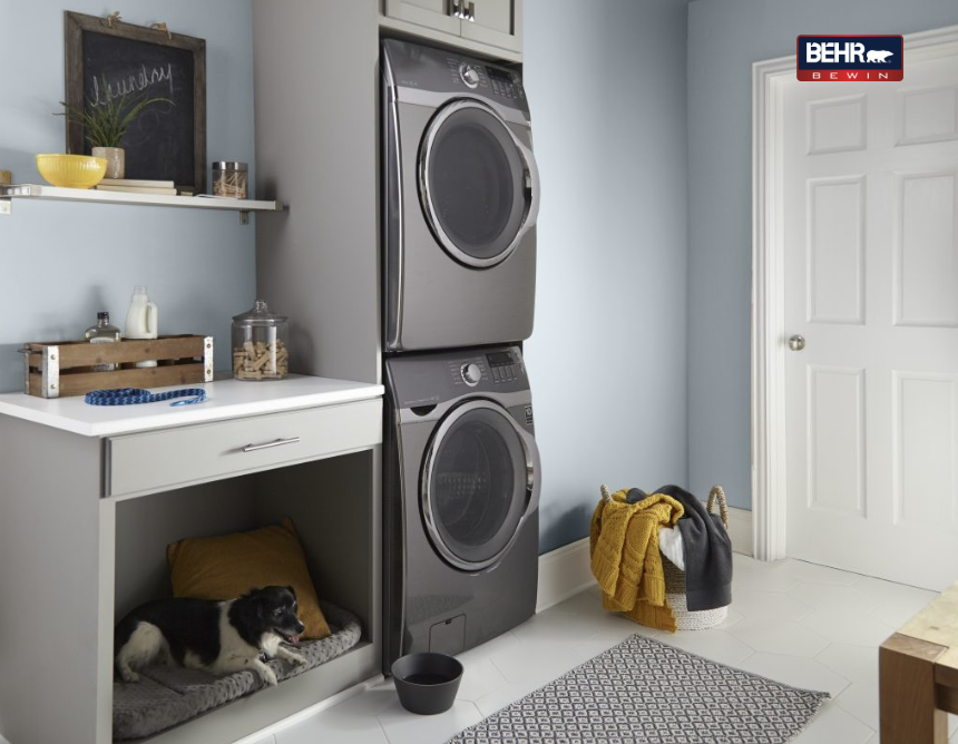 Nếu bạn đang tìm kiếm một không gian giặt ủi thư giãn hơn, hãy chọn màu Spring Sky 674 với tông màu xanh xám nhẹ nhàng, giúp bạn thư thái.