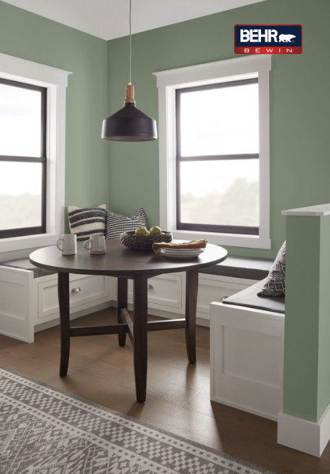 Nếu bạn thích không gian ăn uống thư giãn và tự nhiên, bạn có thể cân nhắc màu xanh dịu nhẹ như Grenada Green 432. Màu xanh nhạt có thể tăng cường cảm giác vui vẻ và bình yên nội tâm.