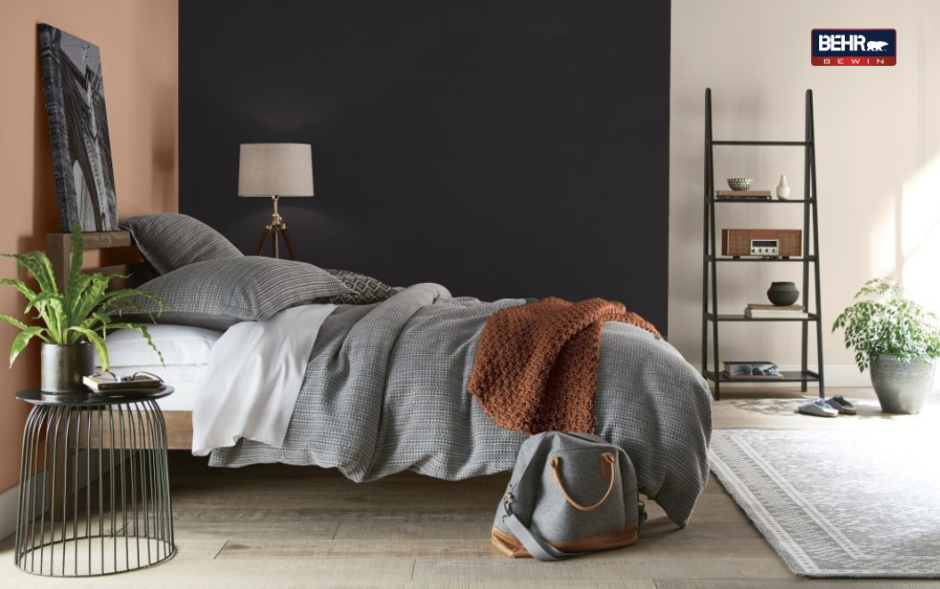 Phòng ngủ này mang lại cảm giác như một chốn bình yên thư thái. Sự ấm áp của màu Linen White 912 và Sycamore 1137 tạo nên sự hứng khởi và tích cực. Bức tường nhấn màu đen đậm với màu Deep Indigo 1442 làm nổi bật căn phòng với một chút ấn tượng.