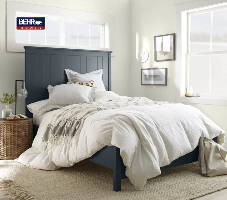 Phòng ngủ này toát lên vẻ tĩnh lặng, thanh bình của một buổi sáng mùa đông. Những bức tường được sơn màu Cloud White 967 mang lại cảm giác mềm mại và yên bình như tuyết mới rơi phản chiếu ánh sáng ban mai, tạo nên một không gian ấm cúng và dễ chịu. Khung giường màu xanh đậm và bộ ga trải giường nhiều lớp với chất liệu tự nhiên làm tăng thêm chiều sâu và mang đến cảm giác thoải mái nhẹ nhàng.