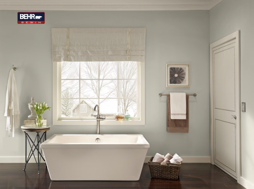 Màu xám ấm áp (Alaskan Husky 1479) mang đến cảm giác nhẹ nhàng và dễ chịu cho phòng tắm này. Sắc màu có chất lượng trầm lắng, mờ ảo, đủ xám để tạo cảm giác sạch sẽ và hiện đại, nhưng vẫn được làm dịu đi bởi những tông màu ấm áp, khiến nó trở nên mời gọi. Kết hợp với bồn tắm màu trắng, căn phòng trở thành không gian thư giãn, một phiên bản spa tại nhà vào một buổi chiều tuyết rơi.